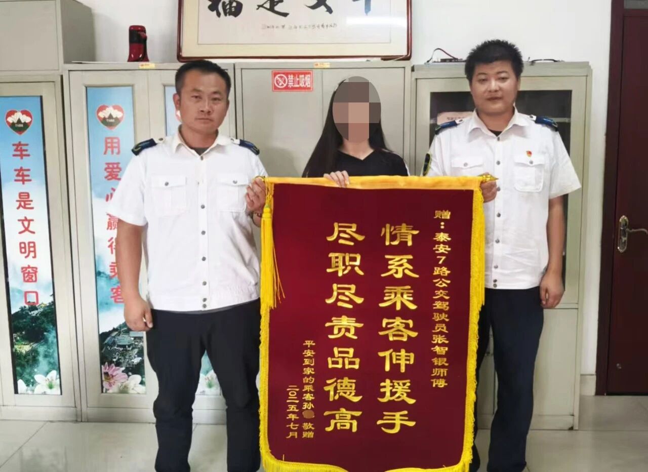 8月1日上午,泰安公交第三分公司辦公室里,一面寫著“情系乘客伸援手 盡職盡責(zé)品德高”的錦旗格外醒目。這是泰城市民孫女士專門送給該分公司7路公交駕駛員張智銀的,她反復(fù)訴說著感謝,這份謝意源于幾天前那個暴雨傾盆的深夜。
